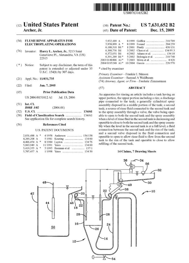 In the instant invention, after a part or article is treated, it is placed into the rinse tank that is filled with a rinse fluid, such as, typically, deionized water or, alternatively, a non-aqueous based fluid. After a length of time, the rinse tank is flushed (similar to a toilet flush) and the article is sprayed while the tank is being flushed. The rinse discharge goes to a recovery tank dedicated to one type of contaminant. The article is then placed in a process tank for further processing, or, if processing is finished, removed to another area. Some advantages of the instant invention include: a single rinse tank usable for all processes; full control over rinse water quality at all times; rinse fluid may be hot for a certain operation then cold for another operation; compact size minimizes floor space; minimal distance between tanks minimizes oxidation during transfers; smooth flush tank minimizes cross contamination; rinse tank is filled by gravity (laminar flow) or pump to minimize fluid aeration; rinse tank is drained by gravity or pump; rinse tank waste fluid is diverted for recovery by type of contaminant; batch plating may be automated using rotary gantry with linear actuator wherein the position of the gantry is used to position the waste water diverter; multiple parts may be processed using different process steps for each part by utilizing a rotary robot.