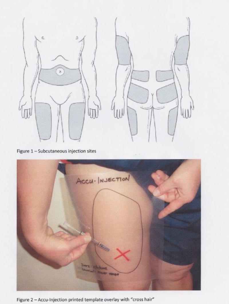 Accu- Injection may work something like this: the patient prepares for the daily injection by accessing the Accu-Injection program, which provides that day’s best location for the injection. A clean template is printed out containing an injection point “cross hair”. The template is overlaid in a location on the body specific to the patient’s medical condition and appropriate injection site. The patient performs the injection at the site marked by the “cross hair”. After the injection is performed, the patient confirms with the Accu-Injection software that the injection was administered in the site as prescribed. Once confirmed and recorded by date, Accu-Injection determines the following day’s optimum injection location.