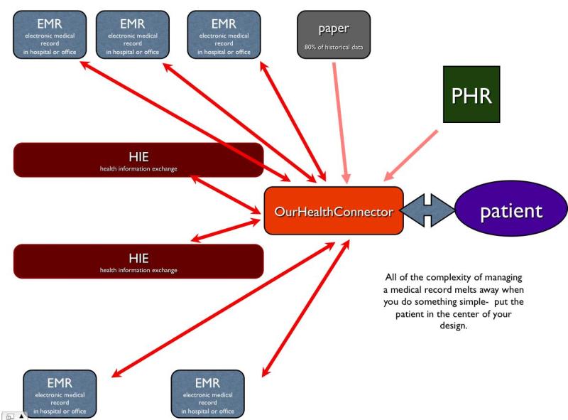 Electronic medical records will not have broad adoption until they are part of a practical solution that generates records that are problem-oriented, accurate, complete, and transportable, and secure. OurHealthConnector creates and maintains a world class medical record that is owned by the patient. It requires heavy lifting and a combination of caring, tenacity, and technology. Once created, is our job to help the patient get that complete record in the hands of the next caregiver in a form they can use without interruption.