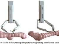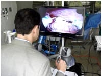The miniature robot is inserted through a single incision at the navel, which makes it less invasive than most current laparoscopic procedures.  These robots represent a paradigm shift in robotic surgery by allowing the robot’s actuators to be entirely contained within the abdominal cavity during the surgery. Due to the software intermediary between the surgeon and the robot, the surgeon need not be in the operating room.  The surgeon operates from a user interface and controls the robot while viewing the procedure on a monitor. The controller has the ability to scale the surgeon movements, reduce hand tremors, and potentially perform autonomous, repetitive tasks such as suturing.  Early testing of this type of robot has shown that they are a practical device that is evolving into a useful surgical tool.