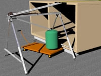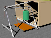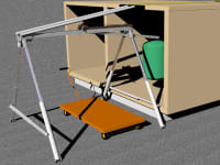 The lifting arm is attached to a sliding trolley with brake. The arm extends out past the A-frame support to reach above the compressor.