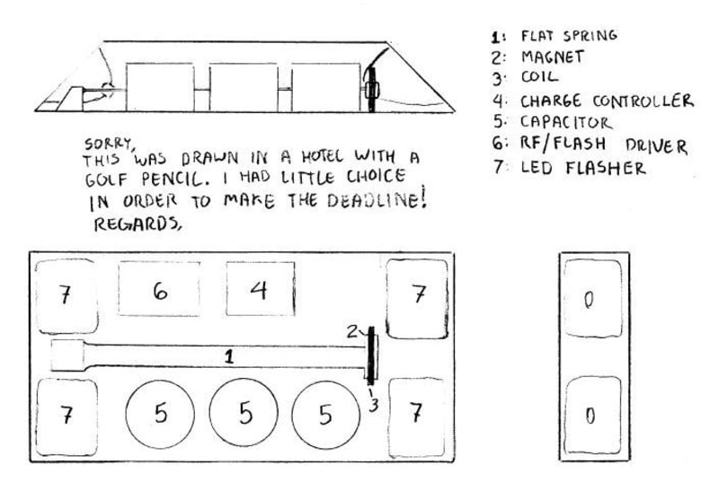 In a package similar to current lane markers in size and shape, I intend to harness the power of vibrations from vehicles. These vibrations could be used to generate a small electrical current within the device through the motion of a magnet positioned within a coil and attached to a springy beam tuned to the typical road vibrations. The electrical current generated by the action of the magnet within the coil would be used to charge capacitors. This stored energy would then be used to power a light strobe that could be activated by a radio frequency signal emitted by work crews or emergency vehicles operating in the area.