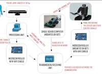 At controller-side, gesture data to be sent to humanoid is obtained through joint-position obtained from Microsoft Kinect, a peripheral, originally designed for gaming purposes. The device tracks 20 essential joints, out of which, tracking 9 joints enable the controller to stimulate locomotion of limbs of robot accordingly. The second controller is responsible for control of torso-joint and tracked locomotion of the robot through a conventional joy-stick.