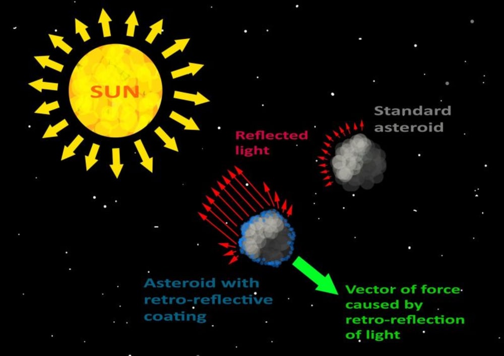 My approach is based on idea to bring the solar wind into the game. This tiny force already has effect on every object in solar system. However, if we will cover surface of an object with reflexive materials, we can increase this force significantly, but less then twice. The smart idea is to use not just reflective material, but involve retro reflective material. Since the sun rays will be reflected preferably back to the Sun, the effect will create vector of force permanently pushing the object out of Sun, no matter on rotation of the object.