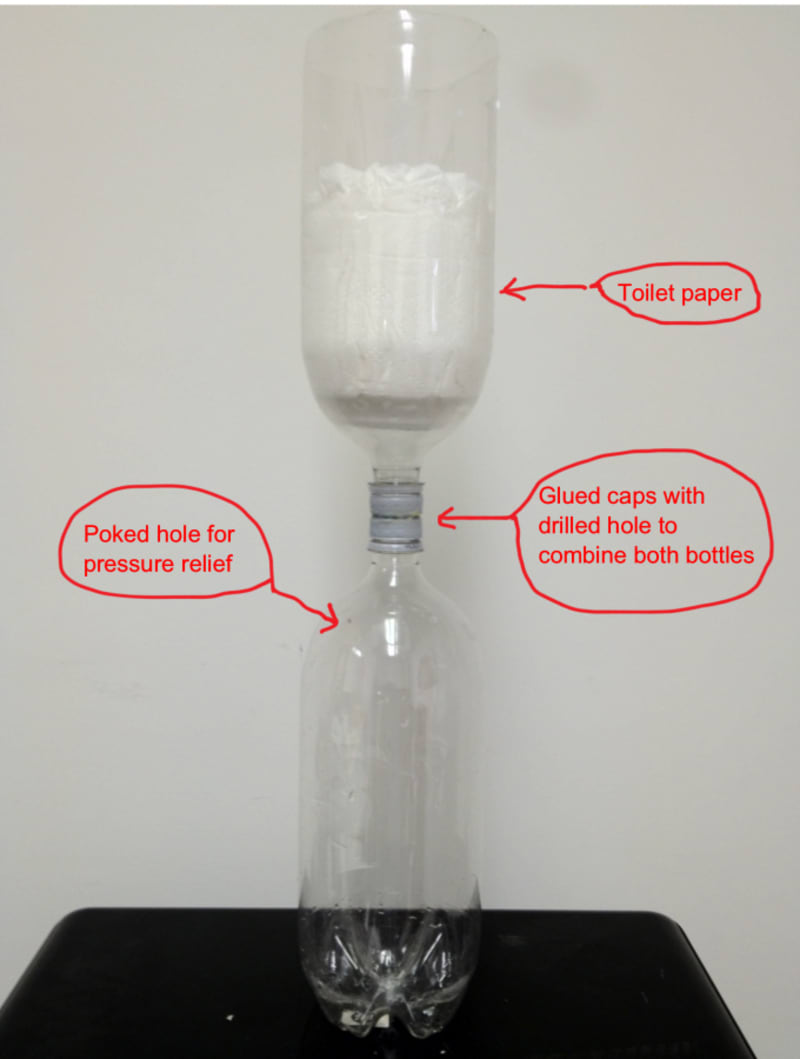 Our answer is a filter system that could be made nearly anywhere and involves only a handful of basic components. To make the filter, two separate 2 liter soda bottles are hot glued together by their caps. A hole is then drilled through the caps to allow flow between the bottles, similar to the classic childhood “tornado in a bottle” experiment. A small hole is then poked into the top neck of the bottom bottle in order to create a pressure release. If this hole was not created, a vacuum effect would affect the system and would prevent a steady water flow. The next step is to cut the top 2 liter bottle in order for a filter to be inserted. The filter is extremely simple: it consists of a roll of toilet paper that has been plugged on one end. Plugging can be accomplished with anything such as a piece of cardboard or plastic. This filter is then inserted into the top cut bottle. The filter system is now complete and can begin filtering dirty water.