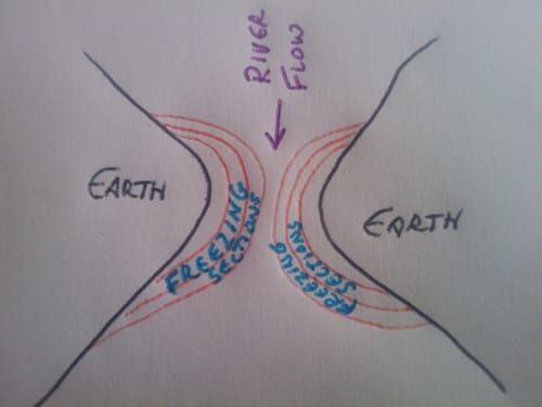 Variable ice dam to stop the flooding destruction in the spring(Mississippi River). The ice dam would be upstream where it's safe to backup the river. Hydropowered freezing units. The water only needs to be cooled a few degrees and slowed down to freeze. The freezing sections would insulate against the coldness being pulled down stream (better freezing ability).