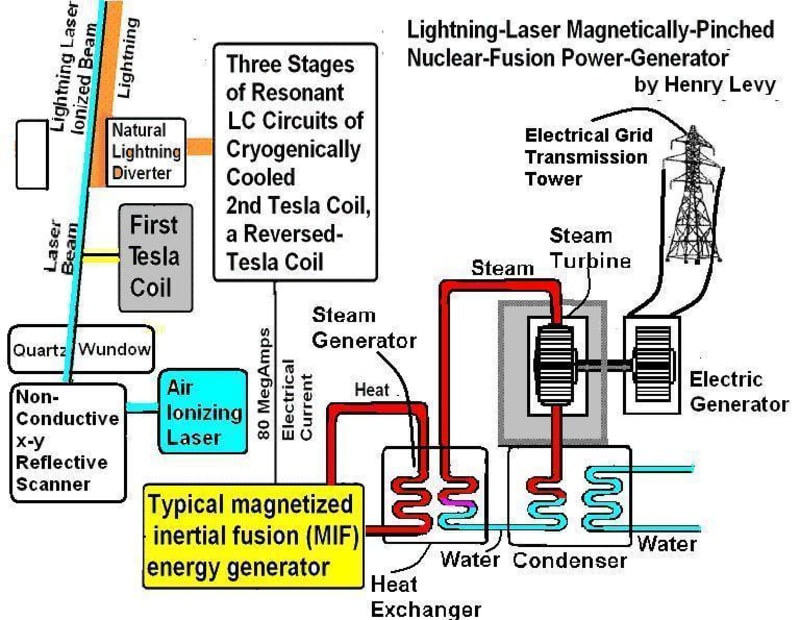 The lightning-laser magnetically-pinched nuclear-fusion power generator emits an air ionizing laser beam such as an ultraviolet laser beam towards the sky. This air ionizing beam produces an ionized conductive column(s) of air which conducts an artificial lightning, high voltage, high alternating frequency electrical current produced by a first tesla coil into the sky, clouds, and ionosphere via single, dual beam(s), or 3 phase conductive channel(s). This ionized electrically conductive lightning laser beam is swept by a nonconductive reflecting means (motorized or electro-optically modulated) through the sky atlocations where there's lots of lightning such as Lightning Alley in Florida or in the Congo. Natural lightning is attracted to and will strike the electrically conductive lightning laser beam plasma column(s). A naturally occurring lightning bolt of approximately 30kA to 300kA will follow the conductive lightning laser beam straight to its origin, with decreased resistance, somewhat as conducted through a lightning rod or wire capturing the lightning strike. This powerful natural lightning bolt will be diverted to the resonant circuits of a second tesla coil, a cryogenically cooled superconductive reversed-tesla-coil with very fat guage high current windings, which greatly steps down the lightning strike voltage and simultaneously greatly steps up the current amperage.