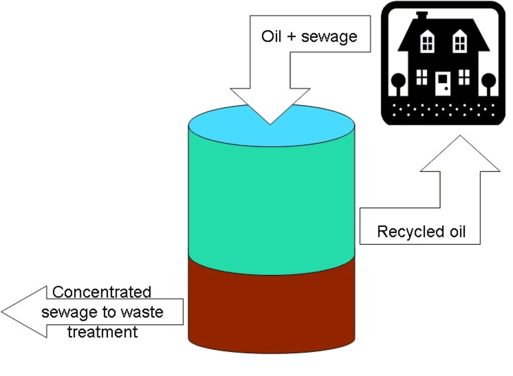 1. Oil and water (in the form of urine) naturally separate. This means the undesireable elements (i.e. urine and faeces) can be easily separated, thereby drastically reducing the volume of material that needs to be pumped to the sewage treatment plant for treatment.