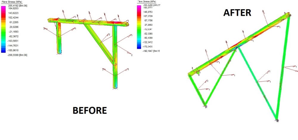 In the image we can see the result when I applied the same load case. The difference is than the weight of the structure at the left (BEFORE) is 42,18 Kg while the weight of the structure at the right (AFTER) is 22,15 Kg.