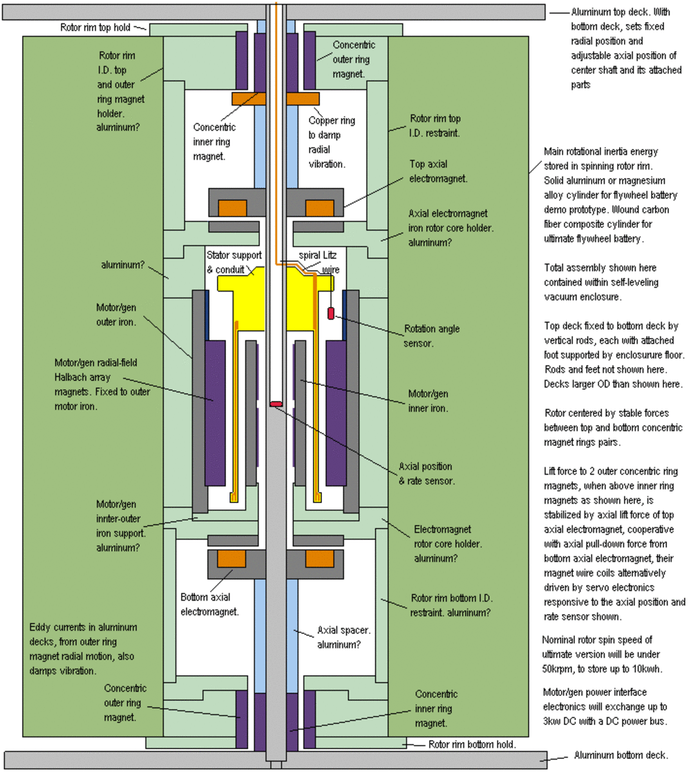 DC kinetic battery has integral regenerative motor; its rotor centered and levitated by concentric ring magnets, axially stabilized by electronics responsive to axial position and rate sensors. The electronics control 2 axial electromagnets, and need only a few watts at steady-state. Flywheel assembly is inside self-leveling vacuum enclosure.