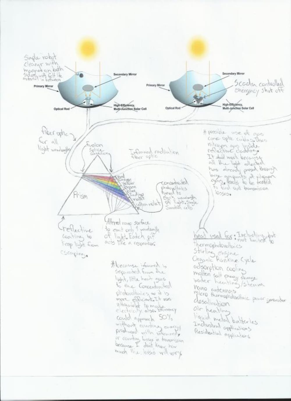 3. They don’t have my vision to create a solar power network world wide transferring energy at the speed of light. The network will still be able to function with partly cloudy conditions. . The competition doesn’t utilize the whole spectrum of light so they are less efficient. I also will use different types of concentrated photovoltaic cell (single junction) tuned to each of the wavelengths of light emitted from the prism nano-structure surface. I also came up with my own light distribution optical cable capable with a gas core using nitrogen gas and reflective cladding around the core and insulation around the cladding. Rather than using a fiber which can be expensive and may not work for all light wavelengths. The light that is concentrated with the parabolic reflectors has already passed through large amounts of nitrogen gas in the atmosphere, so I don’t see why it cant be used as a transport medium for light.