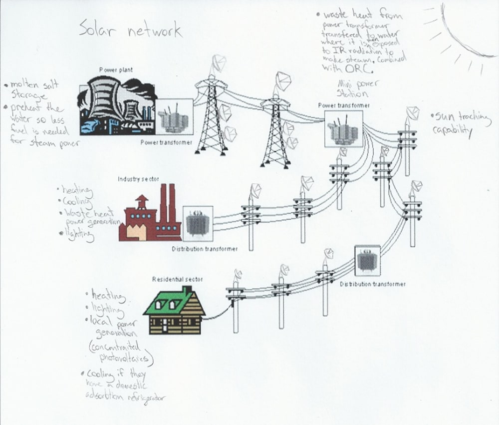 4. The parabolic dishes would be mounted to the top of telephone poles and transmission lines. The network of lines will lead to the customers and the power companies where we can store the heat energy in a thermal fluid to preheat the water so they can use less fossil fuels to super heat the steam. Because we also generate power locally during peak power demand less power is needed from the power companies, so there are less green house gas emissions.