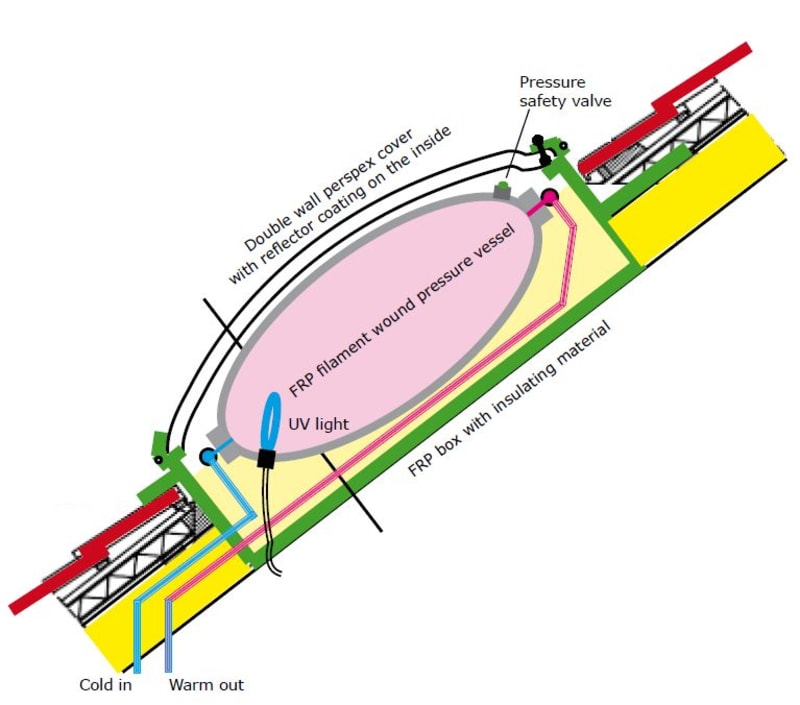 The maximum radiation heat absorption is optimized by the introduction of a special and recently developed nano-black coating to the topside of the FRP vessel.