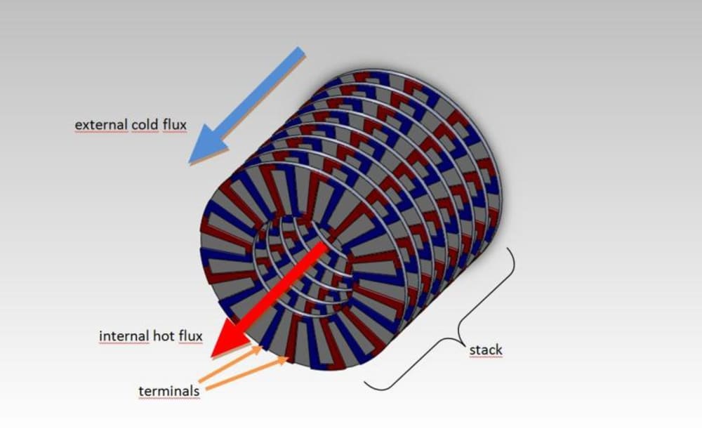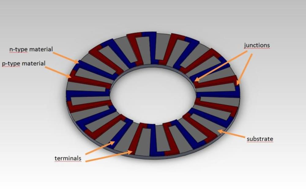 Figure 2 reports one single thermoelectric element made with this technology, and figure 3 shows the arrangement of a basic thin film thermoelectric generator on a tube shaped stack. The inside of the tube is in contact with an hot fluid, while the outside is cooled. The terminals of single elements may be connected in series/parallel to get more voltage or current.