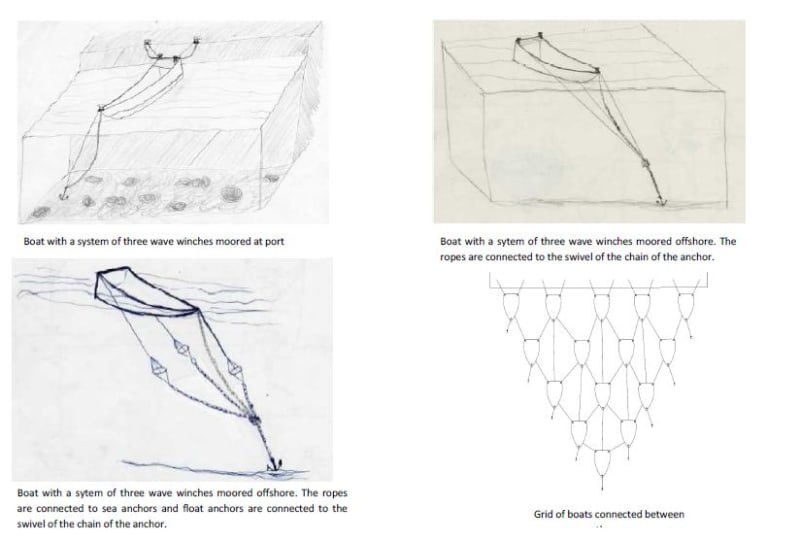 It is possible to establish one or more wave winches on a single boat. Three of them are enough to absorb the energy from the movement of the boat in all its degrees of freedom. It can be used either when the ship is moored at port or offshore. It is also possible to connect boats between them in order to create a grid on the sea surface.