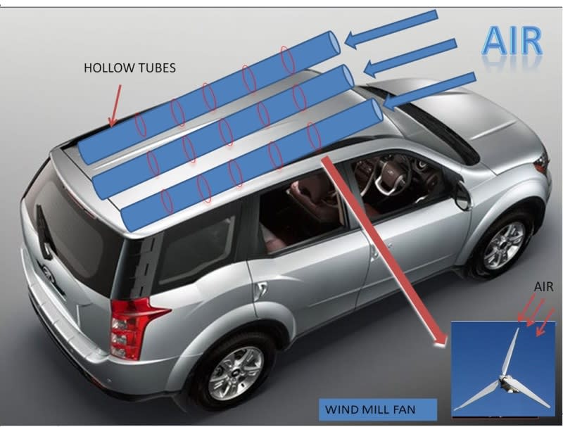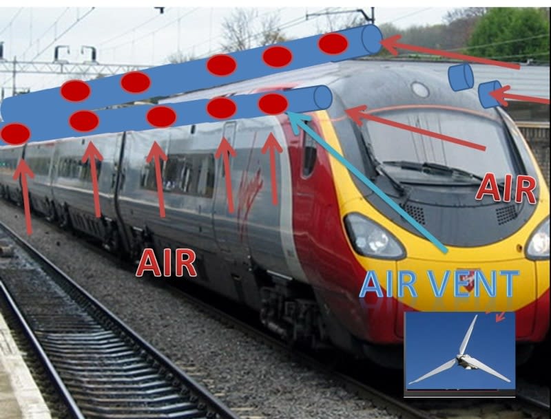 The cost of fuel (diesel/petrol) to drive vehicles is increasing every day and all automobile companies are searching for alternate fuel or renewable source of technology. Great research is going on in development of hybrid vehicles (where one source of energy is engine and another may be electric or other). The motivation behind development of hybrid vehicles is to produce more power with less fuel consumption. My idea is to fix a windmill (small) in the roof or in the front such that as vehicles moves the blade of wind mill also move and produce energy which can be used for charging batteries. This idea can also be used in trains as speed of train is much higher compared to road vehicles. The research can be done in finding the optimised number of wind mill to be installed in vehicles. As shown in figure 1 where we have series-parallel combination of windmill situated inside the tube. in each tube the wind mill will be installed such a way such that there will be some phase difference between each windmill. Figure2 shows the configuration of installing windmill over the train roof or side both side of the train. Vent for air can be provided in some places as shown in fig2 as air rushing inward due to movement of train.