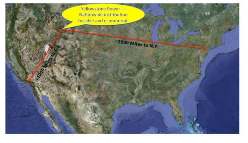 Most hot spots are too deep for our current drilling technology, but there is one geothermal area that is big enough and shallow enough to easily supply all our nation’s power for the foreseeable future: Yellowstone. It sits atop the largest known super-volcano, with a magma chamber about 40 miles long, 20 miles wide, and only 8 miles below the surface. We simply ring the whole caldera with dozens, or even hundreds of small inconspicuous geothermal power plants, completely out of sight of the tourist areas. It is technically and economically viable to transmit high voltage power up to at least 4000 miles. From Yellowstone, it is only about 2000 miles to New York, and 1000 miles to Los Angeles.