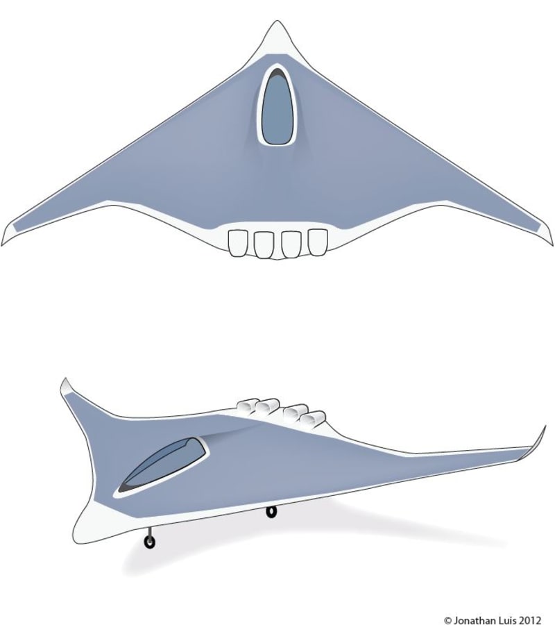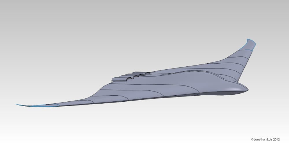 By blending the wings with the fuselage, the aerodynamic efficiency of the airframe is increased due to greatly improved general lift distribution across the span. Since the main body's cross-section is airfoil shaped, the entire aircraft generates lift. This results in a dramatic increase in lift-to-drag ratio. Because of this, a blended wing body has the potential to increase aerodynamic efficiency by approximately 30 percent when compared to an airplane of similar size and payload. [1] In addition, motor nacelles located at the rear of the plane (above the top wing skin) provide a source for boundary layer ingestion (BLI) further improving the efficiency of the lifting-body design.