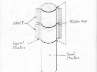 We use the silo's circular shape to simplify moving the VAWTs to an optimum position around the circumference. Thus, giving maximum VAWT performance as wind direction and velocity change. Even existing silo structures could be used as long as design loads are sufficient to support the turbines and resist the added wind force. A silo provides enough height to side-mount a VAWT.