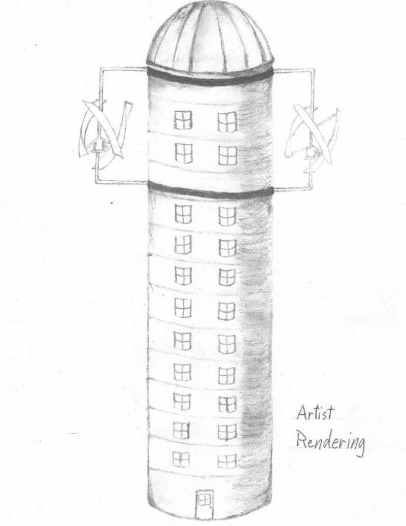 Silos provide less wind resistance than a comparable square pillar, thus making them more stable, even in a tornado. Silo structures have many potential uses: grain storage, warehousing, water tower, homes, offices, apartments, hotels...