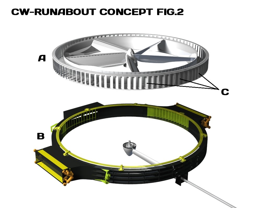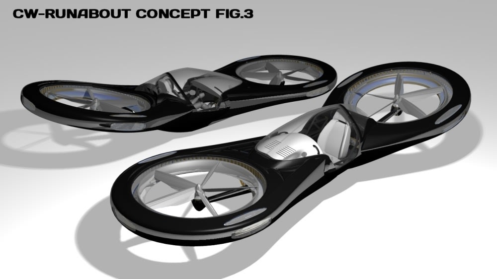 The image in fig.3 shows a single seater version concept of the CW-RUNABOUT using the vented blade system, as you can see it is not a finished version with lights, controls and landing gear etc, it is meant to show what it could possibly look like using the blade system described above. obviously im a bit biased but i think it looks, or at least could look, really cool.