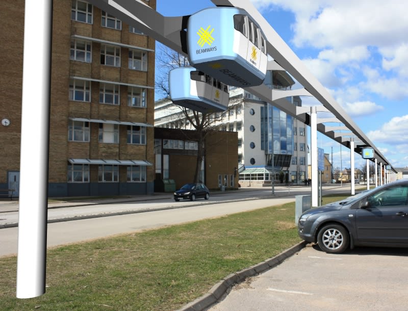 The Beamways system uses several innovative means to achieve low energy and materials use. One is to use a track which is higher than it is wide, as this is best for getting structural stability from the material used. Another idea is to use steel wheels which almost halves the energy consumption (cf train wheels). Another idea is to adjust the pressure on the drive wheel depending on the available friction and traction requirements. Finally the vehicles run under the guideway allowing solar panels to be installed on top to harvest solar energy for the system.