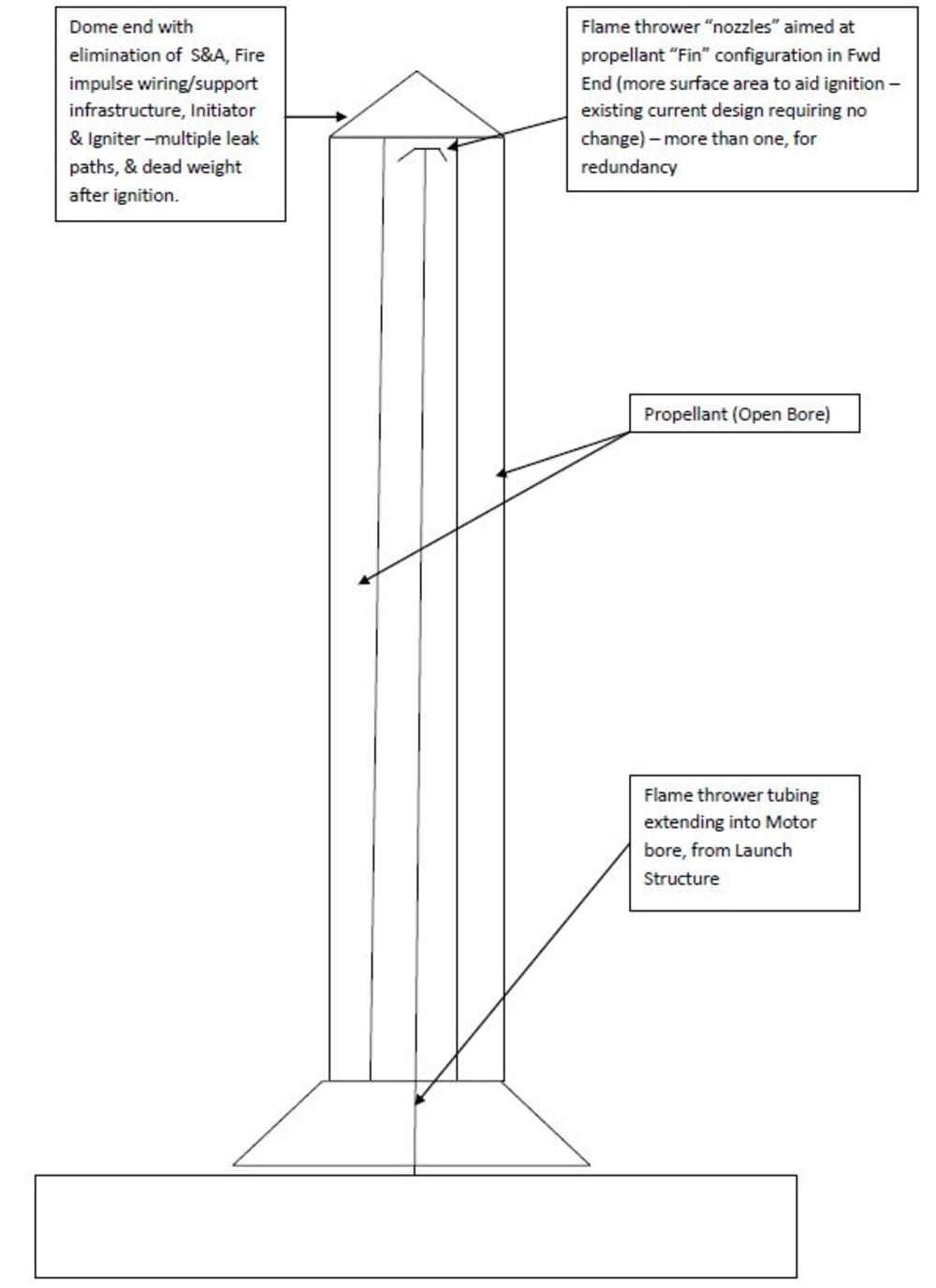 Solution: Design a redundant "flame thrower" that could be a part of the launch pad, with tubing passing up the bore of the motor, then inverting at the head end, with a flame dispersion nozzle that would direct flame onto the propellant grain/fins of the Fwd Segment. Upon ignition, the tubing associated with this would be "consumed" or retracted (melted - could be aluminum tubing).