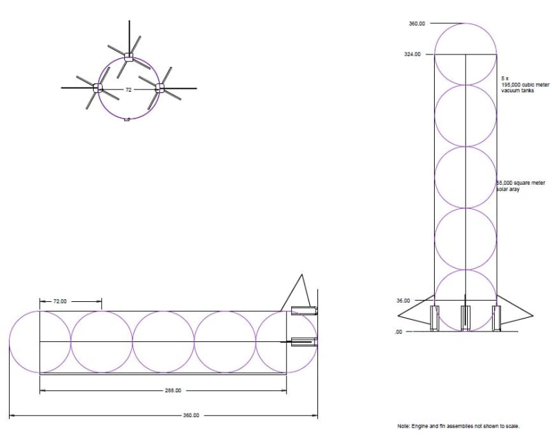 The reference vehicle proposed here is a cargo airship capable of carrying 50 metric tons at a cruise altitude of 10 kilometers. This altitude is chosen as it is above most heavy cloud cover and weather effects, allowing maximum use of the solar cells. It is 360 meters long and 72 meters wide, a ratio chosen for its optimal drag characteristics. Each of five 36 meter radius vacuum tanks has a total volume of 195,000 cubic meters. It has 65,000 square meters of solar cells powering three 240 kilonewton engines. Total interior cabin volume comes to 4,000 cubic meters. Maximum velocity is 120 kph, although recommended cruise velocity is 85 kph.