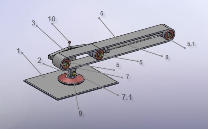 5. Pulleys: 5.1 - a leading pulley - a mounted rotating wheel or a cylindrically shaped device that transmits force and motion to a belt via its rotation. 5.2 - a take-up pulley that maintains belt tension. 5.3 - a bend pulley over which a belt moves to change direction of a pulling force to opposite. The pulleys or their rims are magnetic.