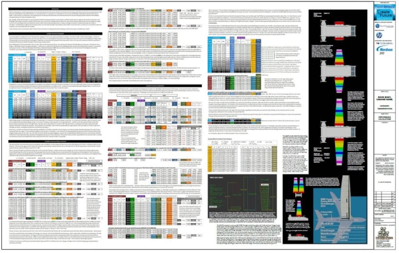 88-footer by 28-feet-beam catamaran, 40tons loaded with 3000kW electric drive installed, cruises at 100knots and goes 3600miles on 5tons fuel at less than 1000BHP, sprints to 195knots on 8000BHP, and clocks Mach0.45 with sails!