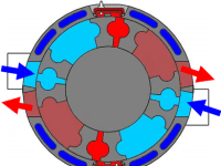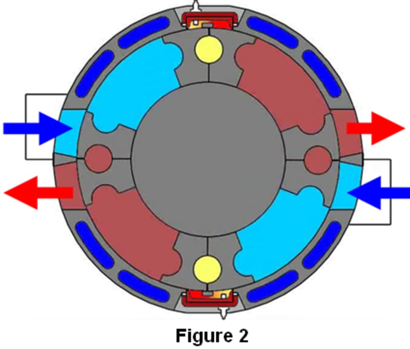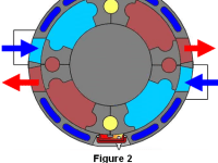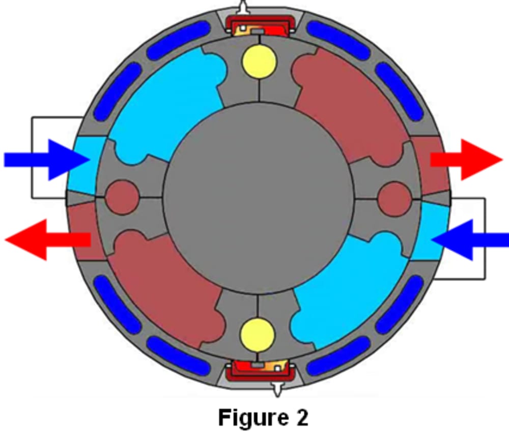 RHE works as follows (Fig.1). AFM (sky blue) through inlet window enters working chamber and compressed there (yellow) between rotor blades. Part of compressed AFM injected into hot combustion chambers. Where it ignites and burns. Primary, ignition of AFM performed by spark-plug or glow plug. Extrusion of exhaust gas (brown) realized between rotor blades in direction to exhaust windows.