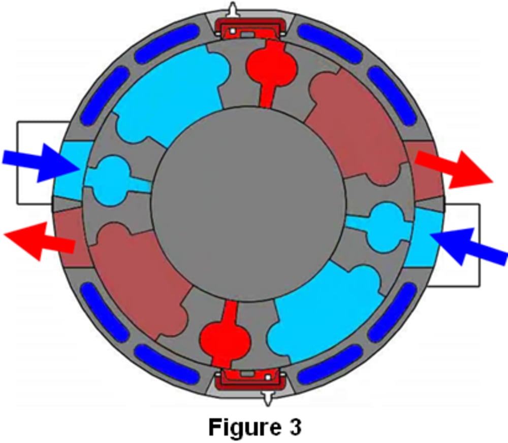 Next movement of rotor blades separates at certain distance (Fig.3). In this case combustion chambers with burning AFM are connected to the working cavity with compressed AFM. The torch does ignition and fuel combustion in closed volume with high pressure and high temperature (red). In this situation blades of rotors fulfill: AFM intakes from inlet ports; exhaust gases outputs from exhaust ports.