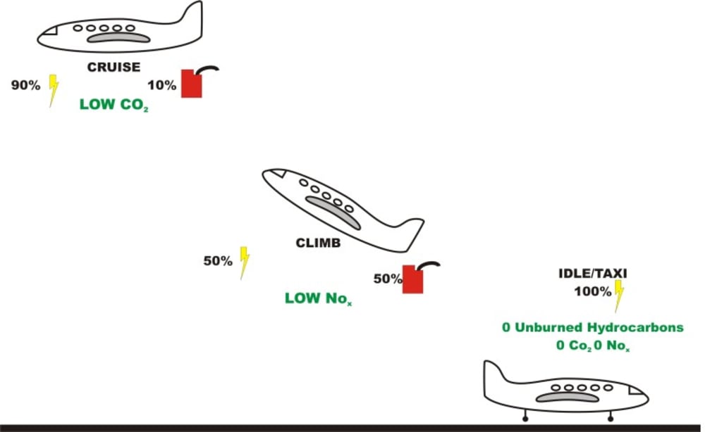 An aircraft equipped with this combined thermodynamic cycle engine, power management electronics, and onboard lithium battery pack will operate using the low NOx burner or electric power at idle conditions, and battery power with fuel generated photoelectric power augmented by waste heat thrust for takeoff. It will cruise using battery power, with fuel generated energy available for range extension. Electric aircraft already on the market can only operate for 1.5 hours due to Lithium-ion battery energy density limitations, and electric aircraft vendors anticipate using IC auxiliary power units to increase time in the air. Extending range by integrating fuel-to-electric conversion directly into the engine architecture is the more forward looking solution.