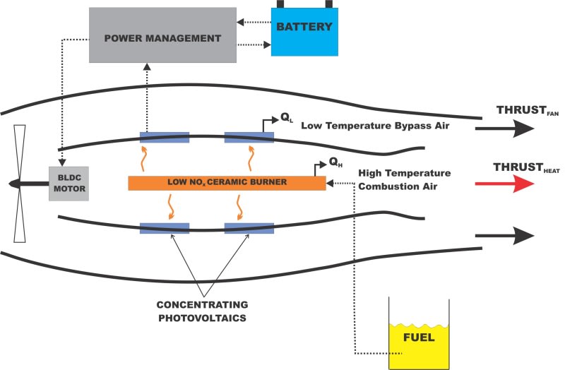 SDGroup’s patent pending propulsion system consists of an electric motor–driven ducted fan in the forward section of the engine nacelle. Rearward is a radiant energy combustor that burns fuel stoichiometrically inside a recuperated ceramic tube. The burner is tuned to emit predominantly in the 300 to 1800 nanometer wavelength, matching the operating bandwidth of concentrating photovoltaic (CPV) cells. These cells line the inside circumference of the duct, have a photon to electricity conversion efficiency of 43%, and a power density of 100 watts per square inch. Dichroic cold mirrors reflect the usable radiation and absorb and convect longwave heat energy into the ducted airstream, providing an additional thrust component.
