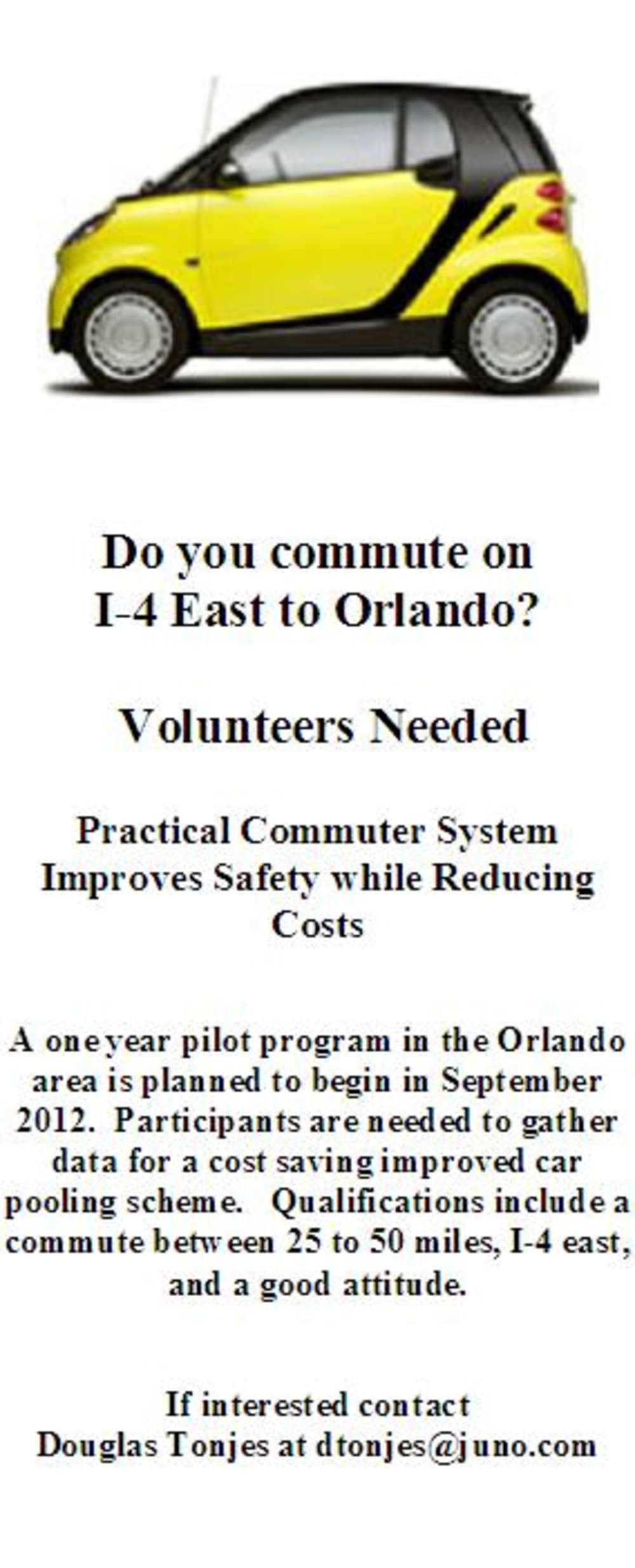 To prove the system a one year pilot program in the Orlando area is planned to begin in September 2012. The program will consist of a class 2 crew cab (4 door) pickup pulling a tandem axle trailer with three small vehicles. Data will be collected automatically using available data loggers plugged into each vehicles onboard data port (OBD). Each workday the group will meet and load the small vehicles on the trailer, commute to the downtown area then unload. They do the reverse at the end of the day. Options are open as to any arrangement desired. Feed back on ease of use, expenses, and how the system is actually used will be closely tracked. If someone must work late or leave early the small vehicles will have at least enough range to complete a one way commute on its own on secondary roads. The program is asking for participants to test this concept. Qualifications include a commute between 25 to 50 miles, I-4 east, and a good attitude. Flyer included promoting participation.