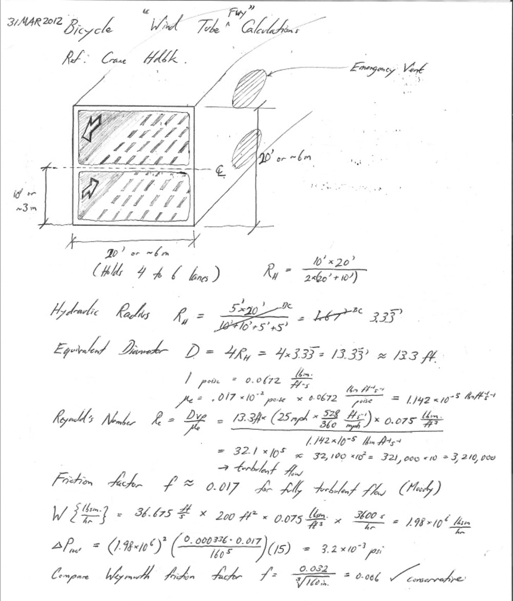 Second, the required power of a centrifugal air pump (as calculated from the pressure drop over 25 miles) is calculated to be approximately 13 MW. This result assumed only one pump, situated at the end of a tube with no bi-directional air recycling, and thus represents a conservative estimate. The power is equivalent to about 17,000 horsepower, which equals ~150 cars. The Wind tube can obviously hold far more riders than this every 25 miles. Because people can return energy to the airflow simply by pedaling until they feel relative headwind, the load on the air pumps is less than 13 MW. It is expected that most cyclists will give back more energy to the airflow than they consume over their entire trip.