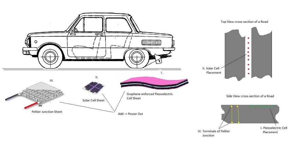 This technology would utilize the roads as power generation stations, by employing cheap sheets of piezoelectric transducers, solar cells and Peltier junctions to convert the energy into usable forms to power up traffic lights, charge up electric vehicles, power up road lights, etc.