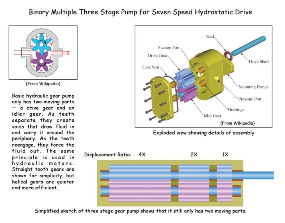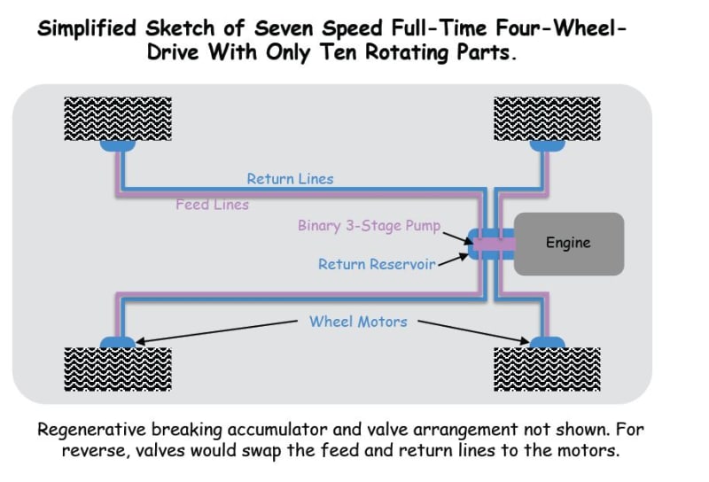 My approach uses a novel “binary-multiple three-stage” gear pump with only two moving parts, plus three two-way valves, and a distribution manifold. It would be cheap, quiet, and only about the size of a shoebox. One moving part is a drive shaft with three fixed gears rotating together as a unit. The gears are all the same diameter and pitch, but are of three different lengths in the binary ratio of 1:2:4. Three more gears are fixed to a counter shaft, forming the second moving part. Baffle plates separate the three pairs of gears forming three pump sections with relative displacements of 1X, 2X, and 4X. At the outlet of each section, a simple valve can divert the flow into a manifold and out to the wheel motors, or back to the reservoir. No clutch is needed. A small accumulator would prevent abruptness.