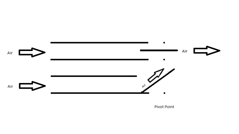 The structure could be as simple as a square tube with a paddle normally in the neutral position allowing all air to flow directly through the structure. In the event the pilot would wish the aircraft to turn right the controls in the aircraft would be used in the identical manner as an aircraft today, only used to cause the right wing paddle to redirect air up and the left wing paddle to redirect air flow down with the resulting force causing the plane to turn to the right. In addition the horizontal stabilizer can be eliminated and replaced with a forward canard and a tail thruster used in a similar manner to cause the tail to be vectored up or down to maintain level flight or control assent or decent.