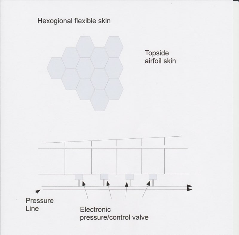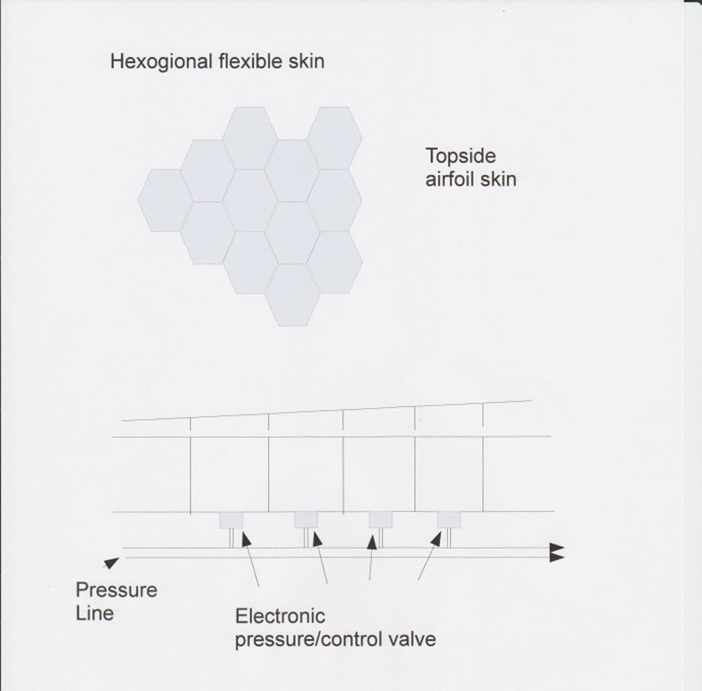 -By means of fluid pressure being pumped into hexagonial chambers inside a flexible skin covering a standard wing structure each individual cell has its own valve and pressure sensor fluid being used is jet fuel as to keep total component weight down.