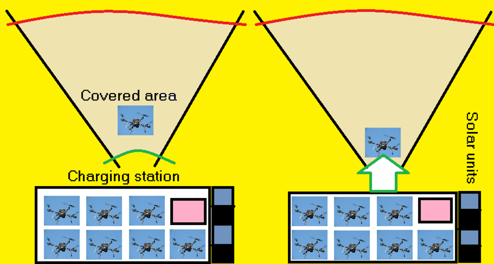 The charging and landing stations will be solar powered as possible to increase automation of the process; they also have to be able to carry enough units to cover the ground while charging the other units.
