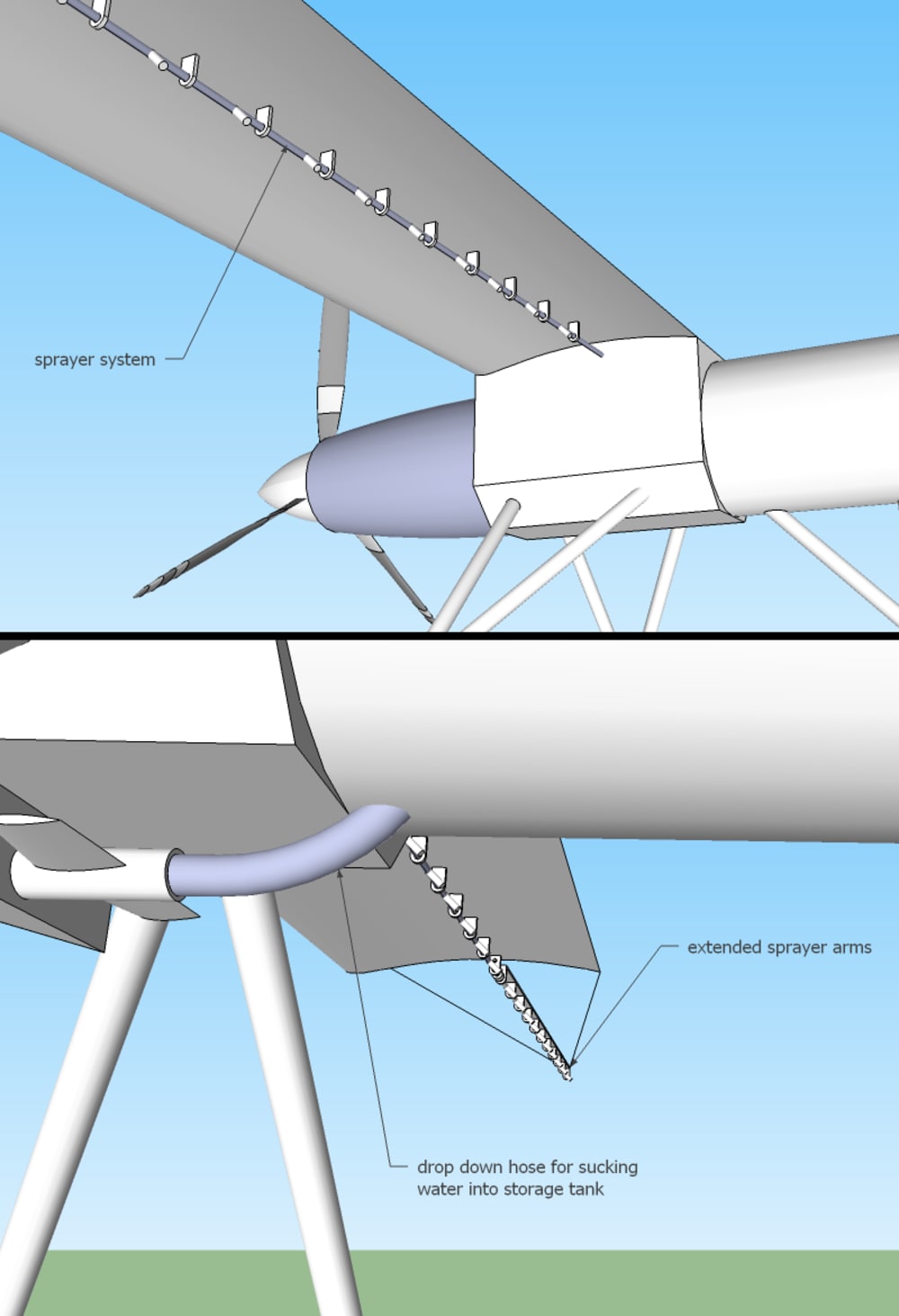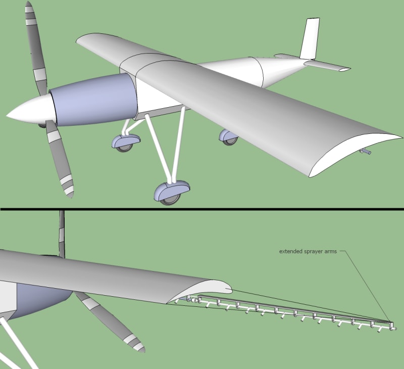 Given that we are currently in a recession and drought, farmers need to protect their crops as best they can. When applying fertilizers and insecticides, a ground-based sprayer system is preferred for smaller farms that cannot afford a piloted aircraft. This and other constraints have reduced the number of aerial crop dusters over the years. This system is intended to be a cheap and effective alternative.