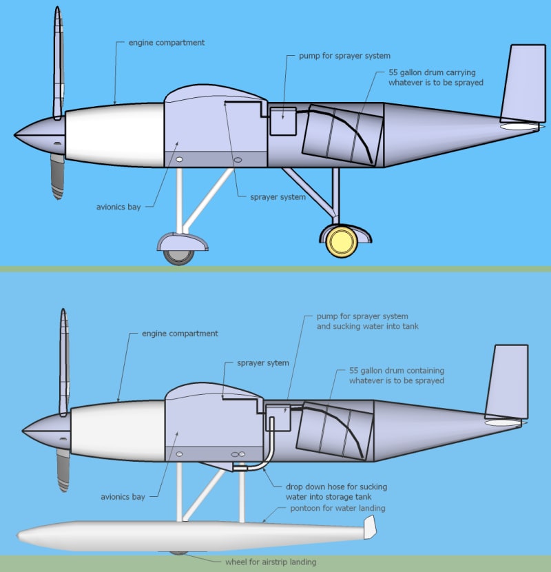 The aircraft will be big enough to get the job done, yet small enough for transport on a trailer. It’ll be controlled by a pilot on the ground, relatively close to the flight path. The safety factor of the aircraft will allow it to be durable with proper maintenance. Applications include, but are not limited to, crop dusting, fire fighting, search and rescue, science, and small cargo transport.