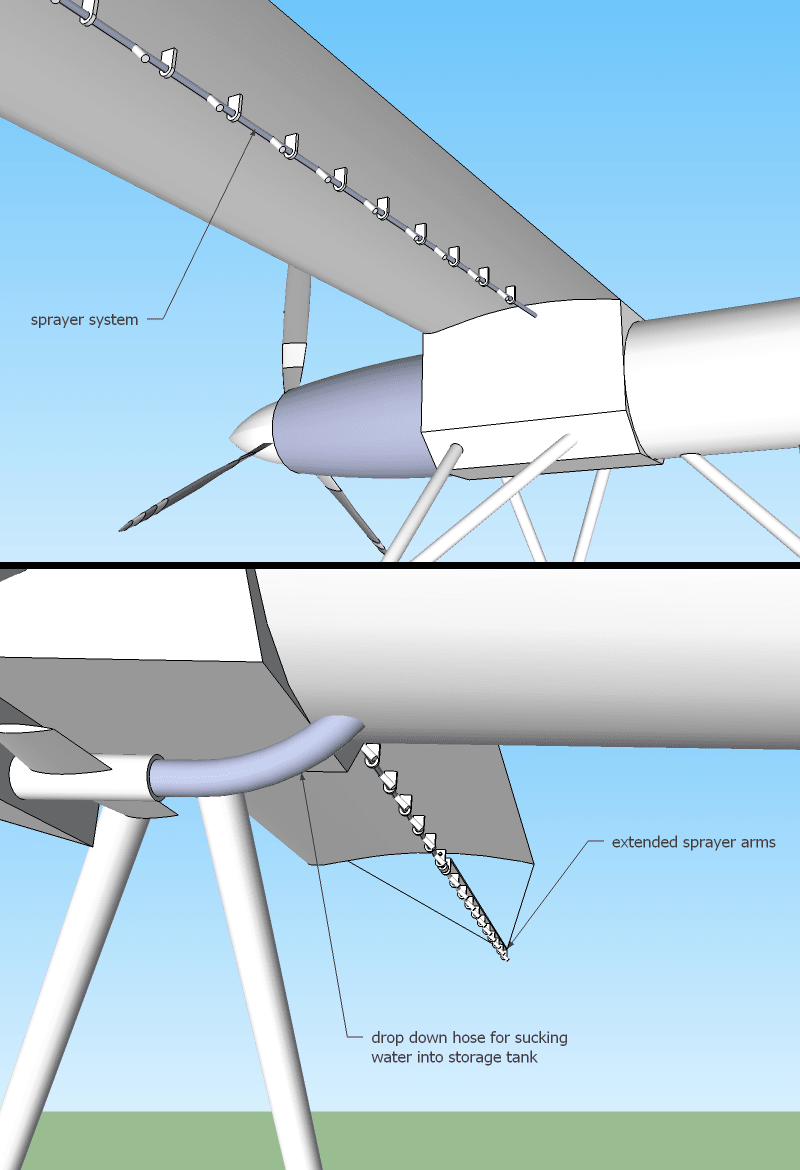 The fire fighting version would be used to locate and fight smaller wild fires. With a major wild fire in the news at least once every year, fire fighters need every advantage possible. This variation of the UMCAV would be modified from the crop duster version and would consist of a hose that can drop from the bottom of the aircraft to refill its water tanks from nearby bodies of water similar to the way helicopters refill their water tanks when fighting fires.