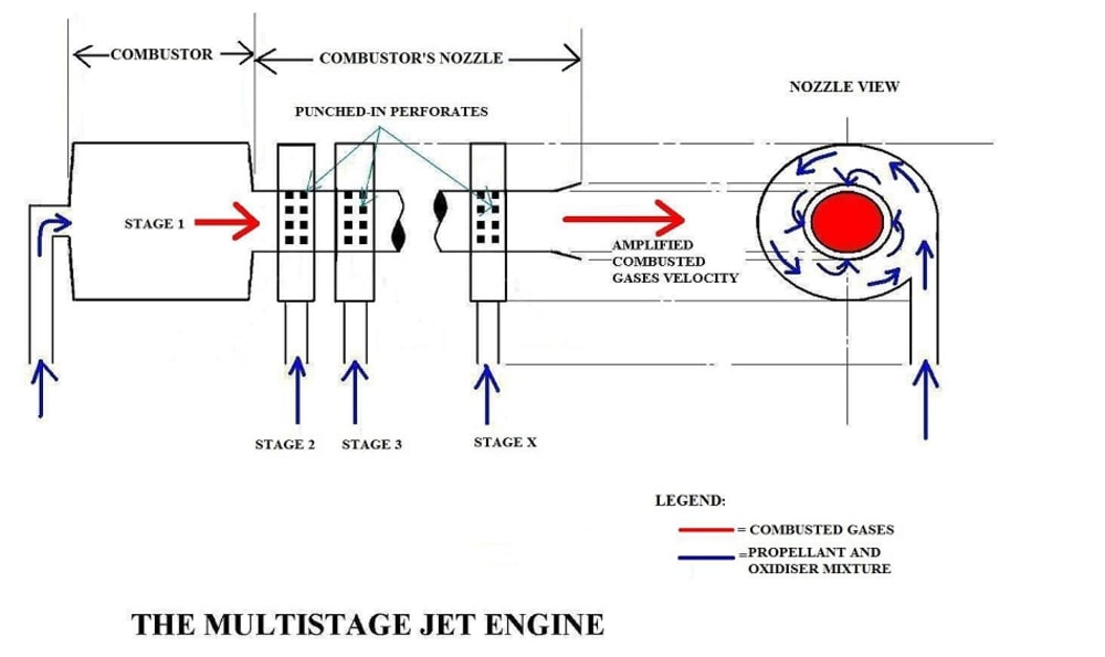 My Multistage Jet Engine design is like two or more combustion chambers or combustors connected in series, each combustion chamber or combustor represents 1 (one) stage each whose fuels combust all together at the same time so that the velocities of the combusted gases are amplified by providing the combusted gases an initial velocity equal to the velocity of the combusted gases that are pushing their way through from the previous stage. The total thrust of the engine is equal to the sum of the combusted gases that are exiting through the mouth of the combustor's nozzle whose velocities were amplified in direct proportion to the number of their respective stage from where they originated. From Newton's Second Law of motion stating that "FORCE=(MASS)(ACCELERATION)", suggesting that if the mass of an object is constant, the net force from an object is directly proportional to its acceleration, which means greater combusted gases velocity means greater thrust force.