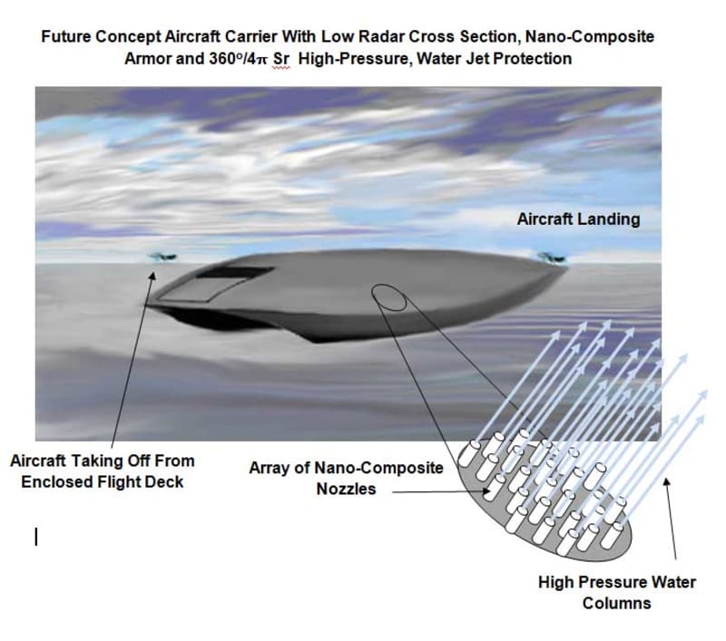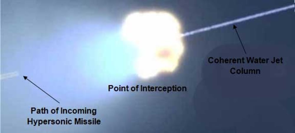 Future Aircraft Carrier Battle Groups (ACBG) will be facing the very real threat of swarm attacks by dozens or even hundreds of hypersonic missiles. With the ongoing advancement of modern missile technology, it will become increasingly difficult to destroy missiles before they are launched. For example, the cost of upgrading Aegis cruisers and destroyers to counter missiles such as the Chinese DF-21 D will be about $10 billion. The ranges and speeds of anti-ship missiles are continuously increasing, making it impossible to destroy them before launch in constrained areas such as the Persian Gulf. With future projected velocities exceeding Mack 5 (6,200 kph at sea level) current defense systems will not be able to react in time. Also, the MK 15 Phalanx Close-In Weapons System could be overwhelmed by using a swarm attack by simultaneously firing hundreds of missiles at one aircraft carrier...The defensive system would soon simply run out of ammunition. Since the one material that is infinitely available to ships at sea is water, it makes sense to consider using it as a defensive system.
