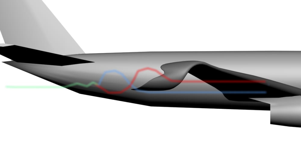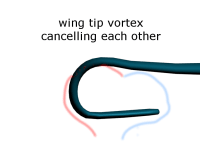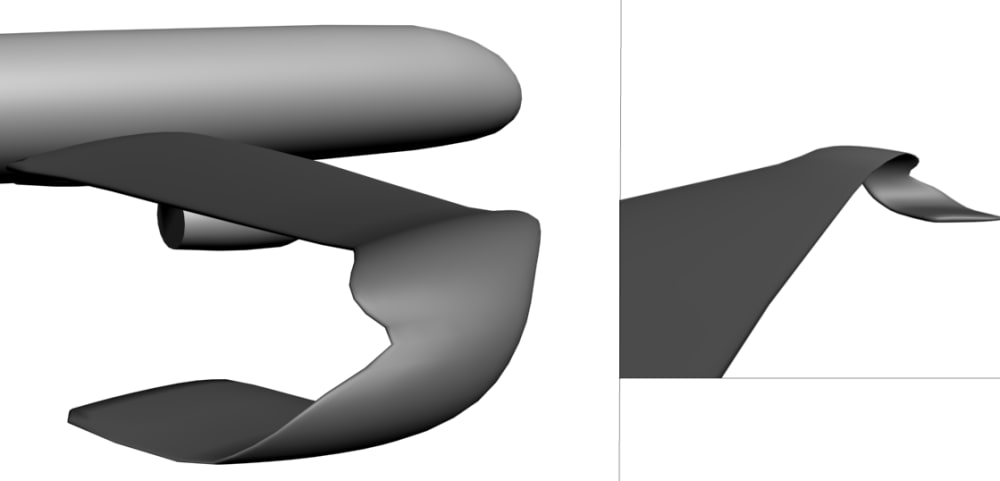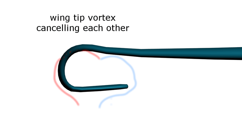 The vortex cancelling winglet drastically reduce the vortex generated by a plane, it works by creating two vortexes that rotate in opposite directions, that way they collapse against each other and are cancelled.