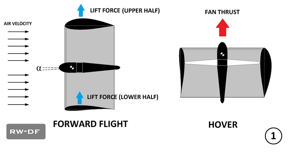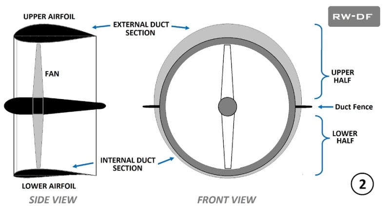 As shown in Figure 1, the upper section of the duct is not equal to the lower section. However, in hover the different sections do not affect the performance, but in forward flight the different wing sections produce lift, increasing flight endurance and the stability.