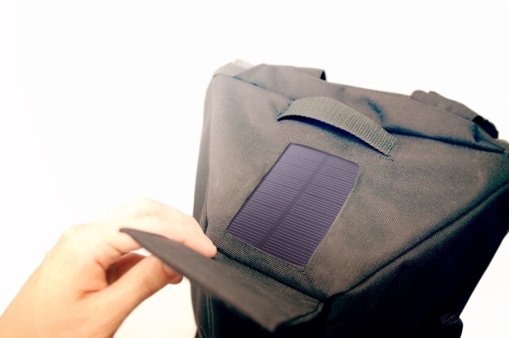 A 4000 mAh battery/solar charger integrated into the top panel enables you to charge your mobile device on the go in the easily accessible kangaroo-style pocket on the strap, and powers built-in LED light piping on the back of the pack to increase visibility during late night bike commutes.