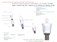 Our revolutionary structure of transparent filter bag combines filter material and package material to form a functional hollow bag, includes an outer transparent plastic film pocket and an inner filter cone, two parts are adhered together on bottom edges, the section view of cavity is “W” profile. All dirt is trapped in cavity between the inner filter cone and the outer plastic film. The plastic film isolates collected dust inside of the bag filter and allow see through dust accumulation. The inner filter cone not only acts as 1st stage filter in where most of dust and dirt are trapped, but also restricts dirty air path just around 2nd stage filter in shortest. A transparent container equipped with a 2nd stage filter is designed to support the transparent filter bag for most reliable and efficiency. It is easy to check dust accumulation in the transparent filter bag, just pull out a fulfilled bag and replace a new clear filter bag without contacting contaminated filters. The old ideas of having a clear plastic strip on paper filter failed because stress concentration and wrong design concept.